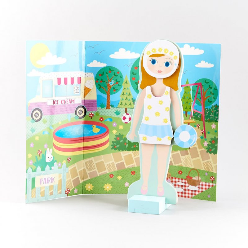 - Floss & Rock Magnetic dress up playsets include a wooden doll with stand, a reversible background scene and 7 different outfit choices