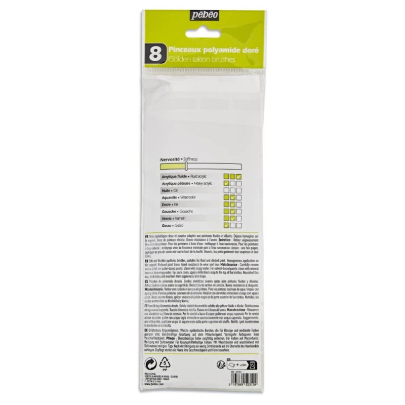 Pébéo's brushes are made of golden taklon, a fine synthetic fibre suitable for all types of work on all surfaces. The soft, flexible bristles provide even colour application and are suitable for fluid paints such as acrylics. Traces are thus reduced. Good resistance to wear and tear.