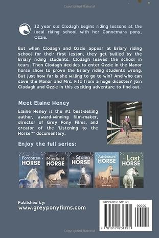 Clodagh decides to enter Ozzie in the Manor horse show to prove Briary riding students wrong. But just how far is she willing to go to win? And who can save the Manor and Mrs. Fitz from a huge disaster? Join Clodagh and Ozzie on their next exciting adventure to find out. This wholesome and beautifully told horse story is perfect for horse-crazy kids aged over 8.