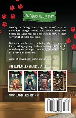 Monday is "Bring Your Dog to School" day in Blackthorn Village, Ireland. Best friends Emily and Sophie age 9, and Jack age 8 can’t wait to show off their very smart labrador dog, Benji. But when lunches start vanishing, the trio stumbles into a baffling mystery. Is there a sneaky thief - or is it something even stranger? Join Emily, Sophie & Jack in this exciting adventure!