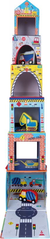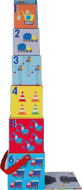 The cool Construction design features diggers, trucks, cement mixers and more. Stack & Play includes 6 stacking cubes, 3 wooden play pieces, 2 on wheels. All parts are stored in the biggest box with a handy carry handle, making it so easy to take around with you!