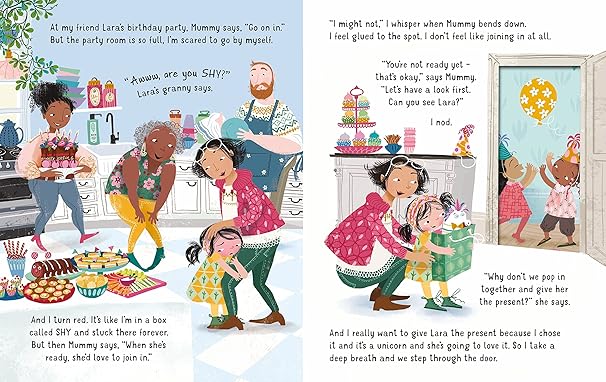 This little girl sometimes finds it very hard to say hello. She struggles going into groups or parties and is very scared of starting a new school. However, when she shares her feelings, she learns that everyone feels shy at some time or another - even her exuberant big brother! Realizing that shyness is just a feeling that will pass, enables her to begin to find her own way to deal with new situations. She doesn't have to know what to say - it's okay to just watch and listen until she is ready to join in. And nervous butterflies she feels on her first day? They help her pay attention - and notice children who might become wonderful new friends! The believable characters, busy scenes and ingenious holes in the pages make this a heartwarming story that young children can relate to. It's a perfect book to help children cope with feeling shy. |