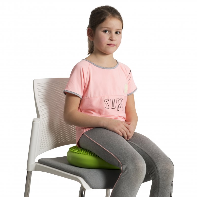 Versatile inflatable cushion can be used while sitting, standing, or lying on the floor. It can be used while seated to release accumulated energy, improve concentration and promote a good sitting posture. Used while standing it enhances proprioceptive and balance skills.