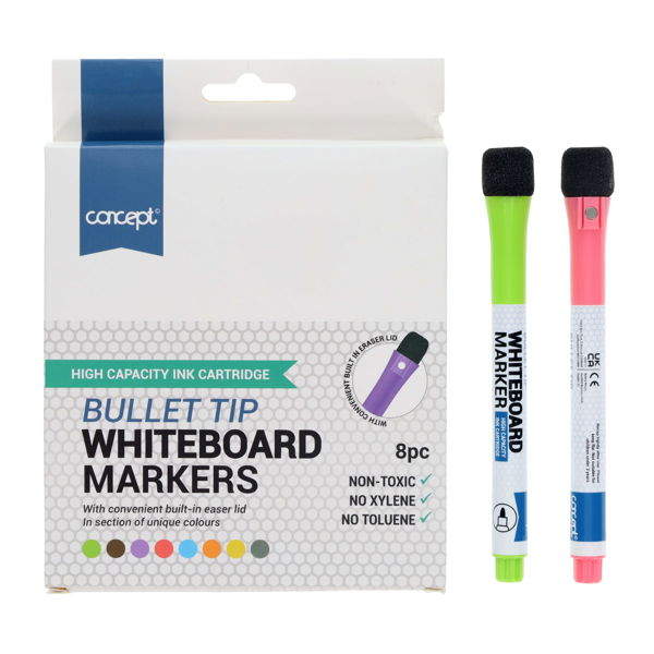 Concept Pkt.8 Bullet Tip Whiteboard Markers With Eraser Lid - Asst