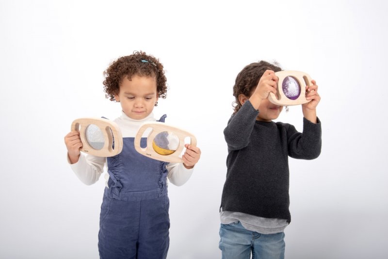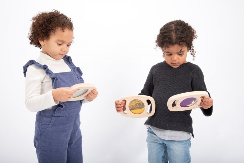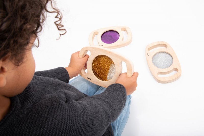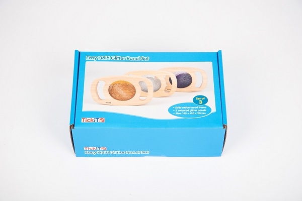 Set of 3 solid rubberwood frames with easy hold handles enclosing a panel of sparkling glitter, one in each colour - purple, silver and gold. The panels can be twisted and turned to make the glitter liquid move and flow in fascinating ways. Ideal for sensory discovery and broadening descriptive vocabulary. Size of frame: 185 x 120 x 20mm (glitter panel 80mm dia.) Pk3.