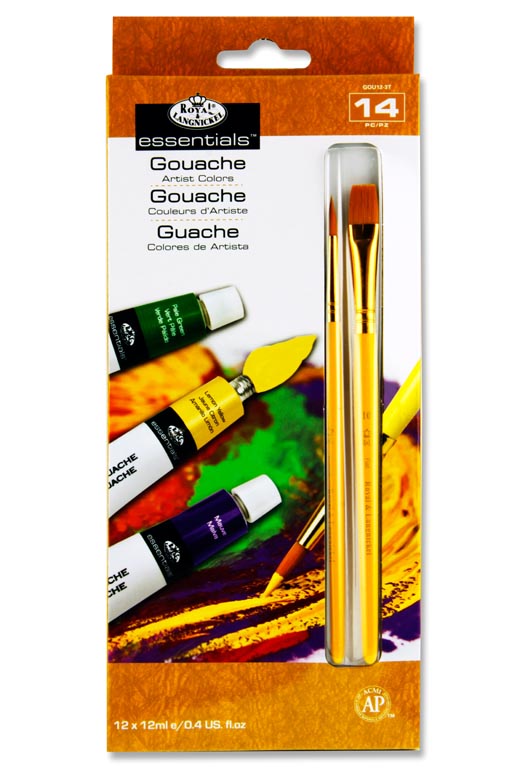 ESSENTIALS 14pce ARTIST BOX 12x12ml TUBES PAINT & 2 BRUSHES - GOUACHE