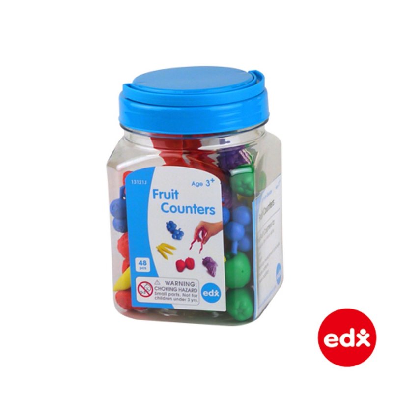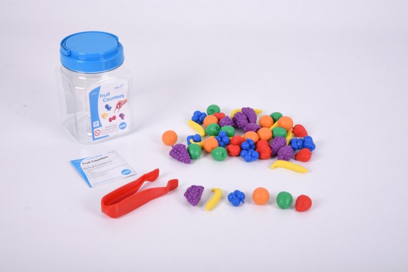 A jar of 48 fruit shaped counters with tweezers and activity guide. Ideal for counting, sorting and using with simple mathematical processes. 6 shapes (strawberry, banana, orange, apple, grapes & blueberry) in 6 colours. Size: approx. 20-50mm.