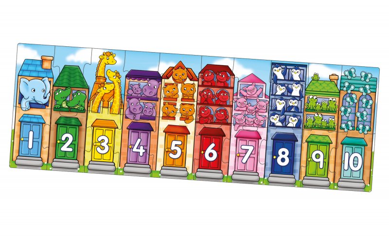 A fun and colourful introduction to counting. Piece together the numbered street from 1 to 10, then find the corresponding number of friendly animals for each house.