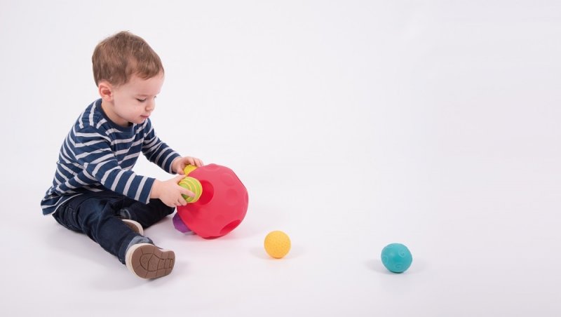 A large colourful textured ball with 6 smaller balls which fit into craters around the surface. An unusual and stimulating resource which can be used with infants to explore actions, reactions, and motor skills; or within a small group of toddlers to encourage conversation and develop hand-eye coordination. The small balls have differently textured surfaces and can be removed and used separately.Size: approx. 185mm dia. |