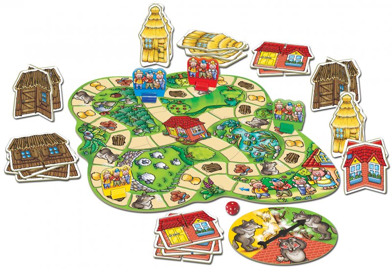 In this simple board game, players must travel around the board collecting and assembling their 3D wood, straw and brick houses.