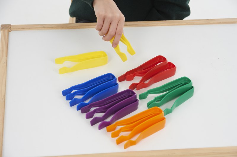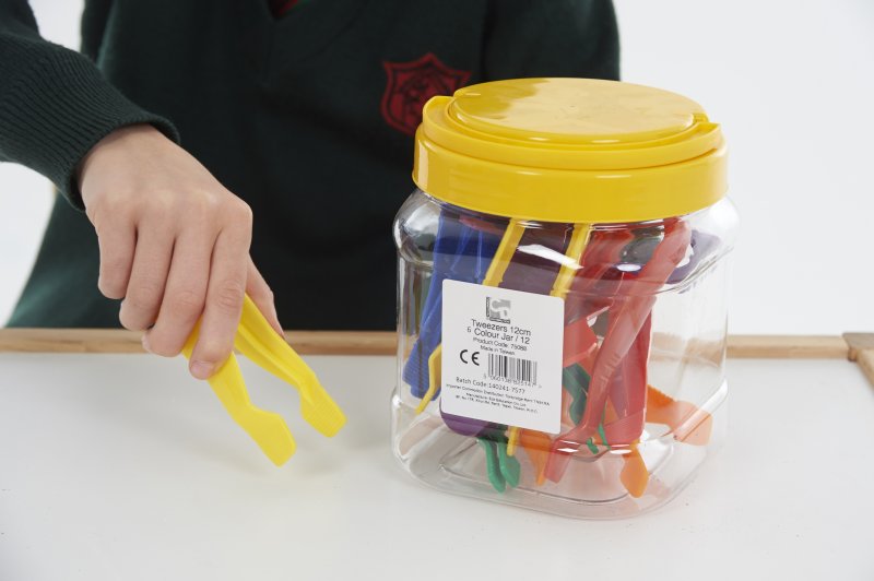 These jumbo tweezers are great to use with young children in early years settings and schools. Using the child-sized tweezers will help children develop their manipulation skills, hand-eye coordination and fine motor control – all essential skills for controlling pencils and other mark making tools. Twelve tweezers in 6 assorted colours supplied in a handy plastic storage jar.