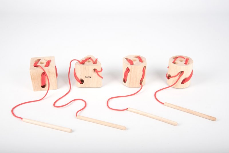 Four beechwood blocks with holes and laces with wooden threader, ideal for developing manual dexterity and hand-eye coordination. Includes cylinder, cube, triangular prism and octagonal prism. Size: approx. 60 x 65mm.